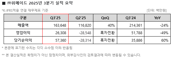 ㈜위메이드(대표 박관호, [112040])가 11일(화) 2025년 3분기 실적을 발표했다. 한국채택국제회계기준(K-IFRS)을 적용한 연결 재무제표 기준 ▲매출 약 1,636억원 ▲영업이익 약 263억원 ▲당기순이익 약 574억원으로 집계됐다.