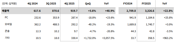 크래프톤의 2025년 연간매출은 3조 3,266억 원을 기록했다. 전년동기대비 22.8% 상승한 수치로 PUBG IP의 성장 지속과 신규 IP 성과로 전년대비 매출이 23% 증가했다. 4분기 매출의 경우 9,197억 원으로 전분기대비 5.6%, 전년동기대비 48.9% 상승했다.