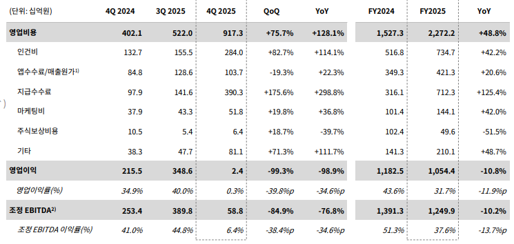 영업이익은 1조 544억 원을 기록했다. 영업이익의 경우 개발 인력과 PUBG 2.0 투자, 일회성 비용 발생으로 전년대비 10.8% 감소했다. 4분기 영업이익은 24억 원을 기록했다.